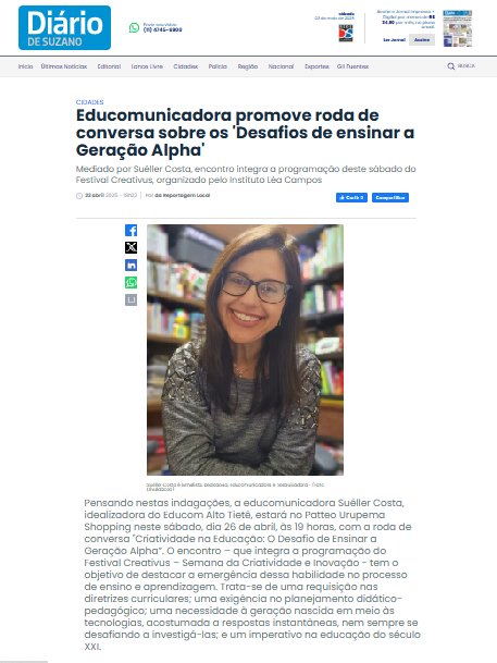 O Diário de Suzano também deu destaque à roda de conversa “Desafios de Ensinar a Geração Alpha”, que integrou a programação do Festival Creativus, do Instituto Léa Campos. Mais um veículo parceiro, que sempre cede espaço para a divulgação das nossas ações.