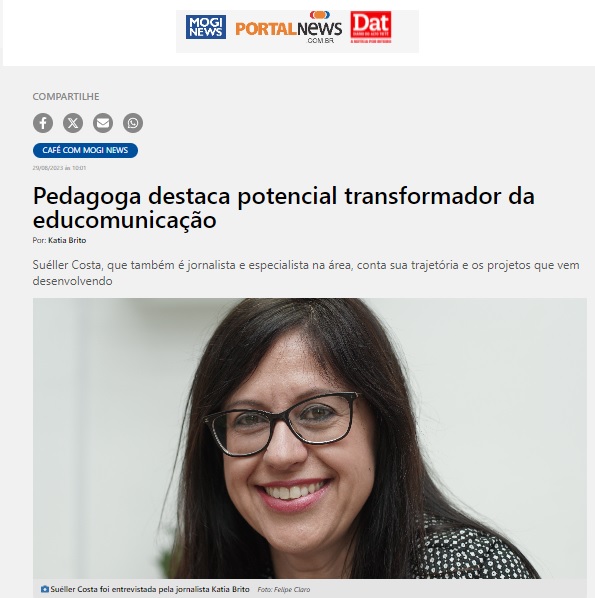 Em entrevista à jornalista Katia Brito, do Grupo Mogi News Comunicação, a idealizadora do Educom Alto Tietê contou sua trajetória na Educomunicação. Suéller Costa, que atua na comunicação – como jornalista – e na educação – como professora e gestora de projetos educomunicativos -, sempre se viu na interface. A estas duas áreas, dedica seus estudos e pesquisas acadêmicas, as quais fundamentam suas práticas profissionais, sobretudo, no universo educacional – tanto formal quanto não formal – para o qual leva a dinâmica educomunicativa em seus projetos junto a alunos, professores e gestores. Durante o bate-papo a educomunicadora destaca o potencial da Educomunicação.